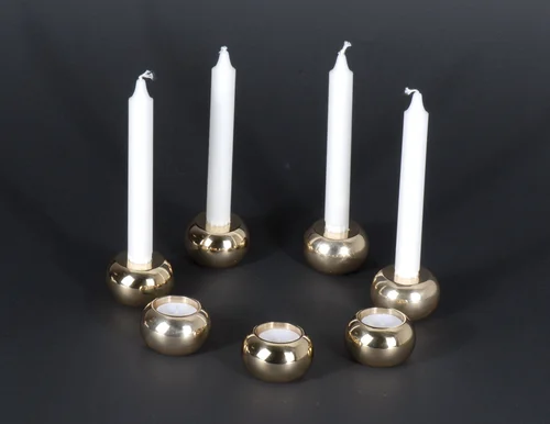 Candle holders in brass with a round form adapted to support both candles and tealights.